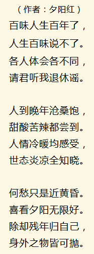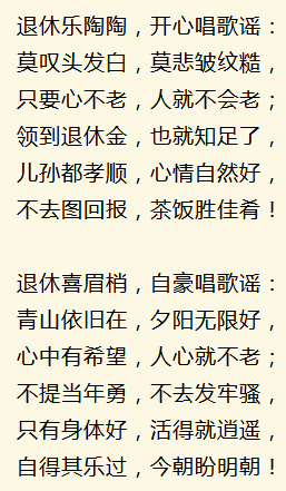 这些退休歌谣都是最新的,总结的太经典了,太精辟了!值得传给天下所有已经退休和即将退休的朋友们。相信幸福快乐属于永不言老的每一位!